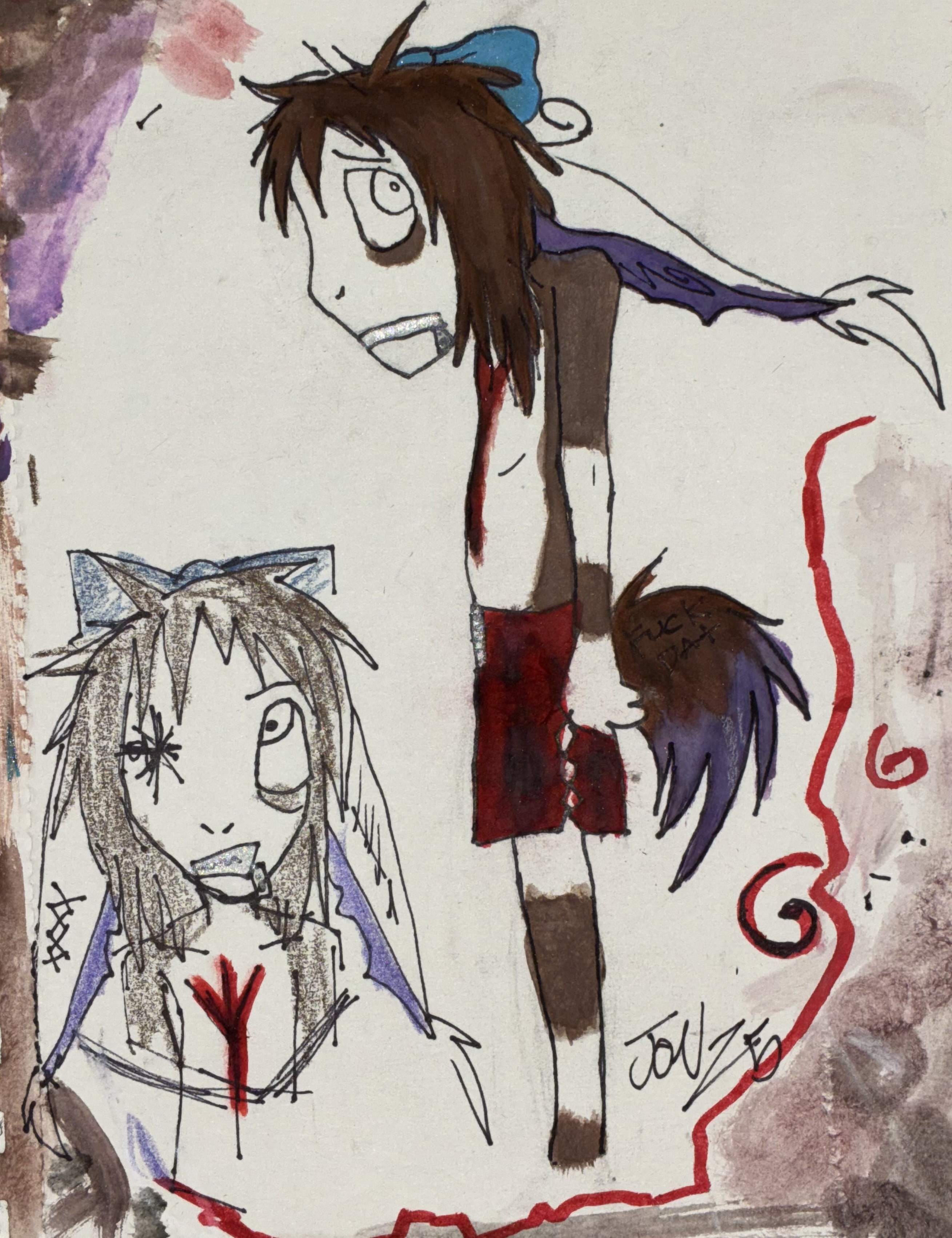 today was so ass but its GYTRGHJJJJJJJJJJJJJJ anyway everybody went to some trip but I stayed at skool cuz it was to some other skool and who cares. some other kid who didnt go was just being a pain. apparently people dont know that if you ignore them MAYBE YOU DONT WANT TO TALK THEM???!? maybe im being a dick but your genuinely fucking retarted. you have no reason to be walking around the room throwing a paper ball around just cuz we have a sub and everyones a field trip. geez sorry, not really but. I've been sick and its kinda hard to breathe and im pretty annoyed still. idint draw anything that good to day but saylor is maybe comeing to my house so thats kool. ill update this again later today maybe.